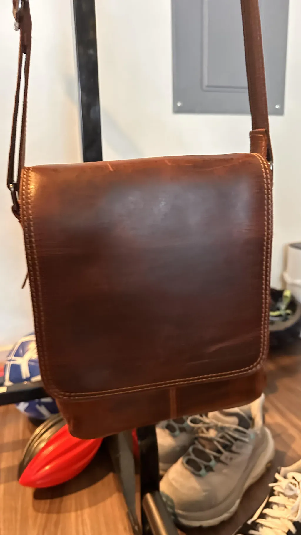 Strap: Adjustable leather strap (up to 65") for crossbody or shoulder wear